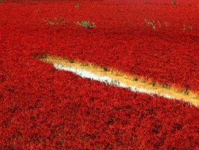 赤い色をしたユニークな草は、アガサ科マツナ属の「Suaeda salsa」で、涼しくなる秋の訪れとともに、徐々に緑色から赤色へと変化する。